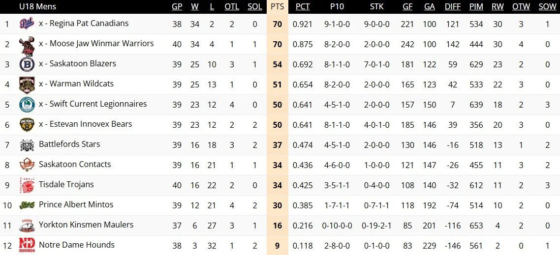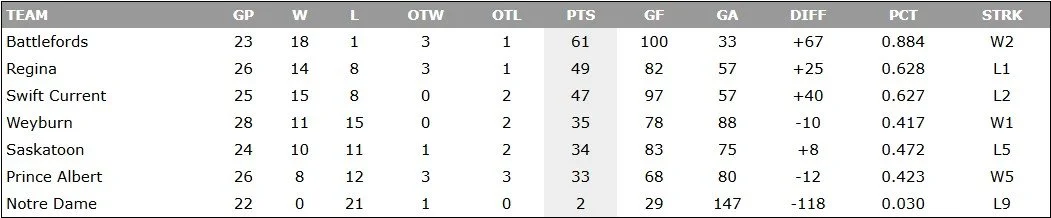 Behind them is Regina (14-8-3-1) and Swift Current (15-8-0-2) in second and third place and are only separated by two points. Then it goes Weyburn (11-15-0-2), Saskatoon (10-11-1-2), and Prince Albert, all of whom are also separated by two points and are in the hunt for fourth place. Cemented in last place this season is Notre Dame, who have yet to win in regulation and stand with a 0-21-1-0 record.